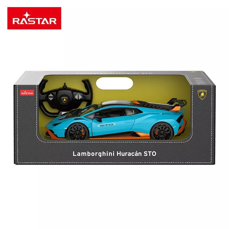 1:14 RC Lamborghini Huracan STO Blue by RastarAMAZING EXTERIOR AND INTERIOR:– Features with front shock absorbers, built-in spring suspension system, rims and tires, dashboard, steering wheel, etc.– Front hood and doors can be opened by manual.– Extra bright LED headlamps and taillights will be working as the Huracan STO RC model car moves forward and reverses.– Rear power motor of high intensity magnetic together with differential mechanism makes the RC Lamborghini Huracan STO run smoothly.FULL FUNCTIONS:– Fast and easy to control, the Rastar Huracan STO RC car moves forwards and backwards, turns left & right with a max speed of 5 mph;– Radio remote range up to 98 feet;– Frequency available in 2.4GHz, you’ll never get any radio interference, which enable multiple cars to racing together at the same time and placeMEASUREMENTS: 12.8x 6.3x 3.5 inchBATTERIES POWERED:Requires 5 x AA for the RC Lamborghini Huracan STO and 2 x AA for the remote, batteries NOT included;Package includes:1 x Rastar RC 1/14 Lamborghini Huracan STO Blue Model Car1 x Remote controller1 x user manual