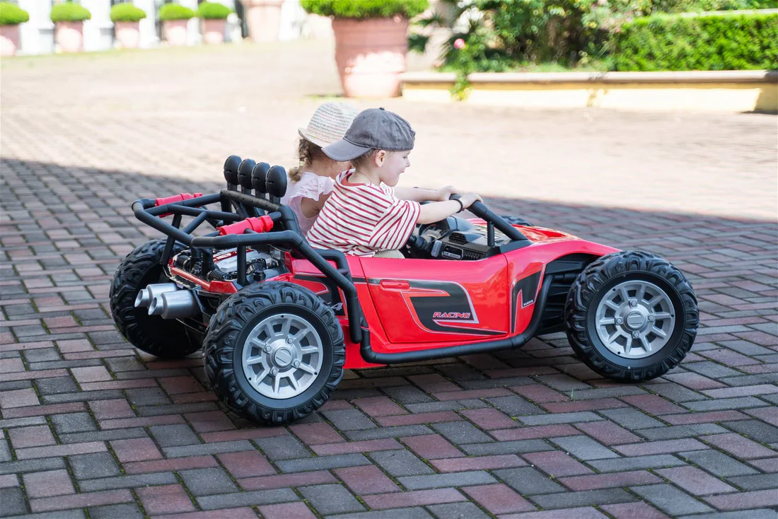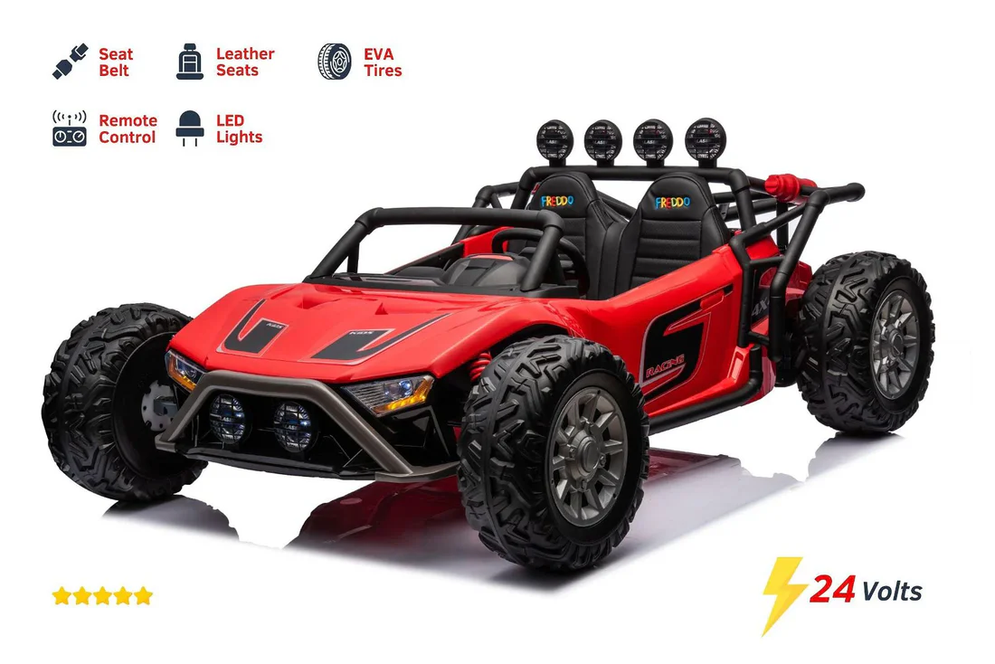 The 24V Freddo Monster 2 Seater Ride on for Kids is the perfect way to keep your children entertained for hours. With its comfortable leather seats, bright LED lights, and powerful 24V 7AH battery, your little ones can explore the outdoors in style. The Parental Control Remote allows you to monitor their rides and keep them safe from harm. It also includes an MP3 + AUX + USB + Bluetooth system, so they can jam out to their favorite tunes. And with its durable EVA tires and max weight of 110 lbs, this ride on can easily accommodate children ages 3-8. Get ready to let your kids explore the world in the 24V Freddo Monster 2 Seater Ride on for Kids.